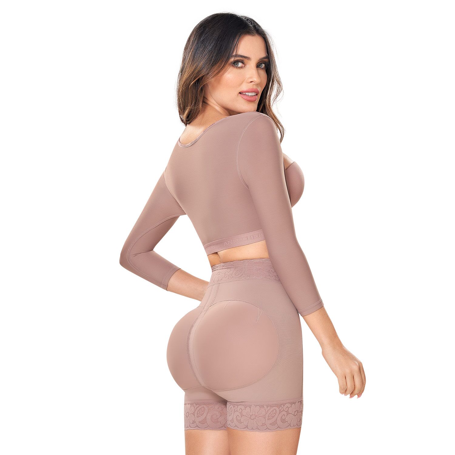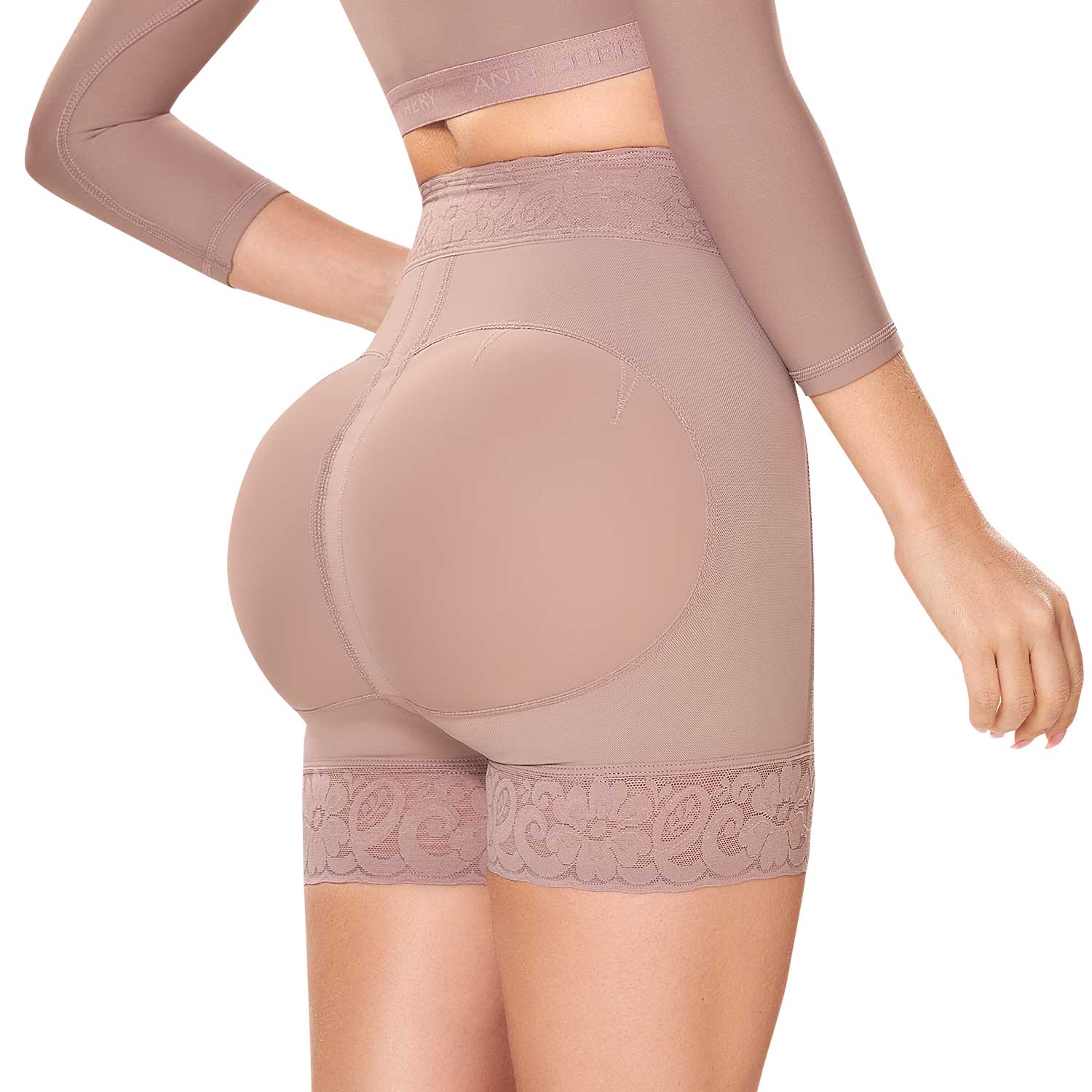 Talle alto en encaje con mini varillas flexibles que dan firmeza a la prenda; realce de glúteo amplio con pinzas de levantamiento, terminación en encaje ultra delgado y silicona.